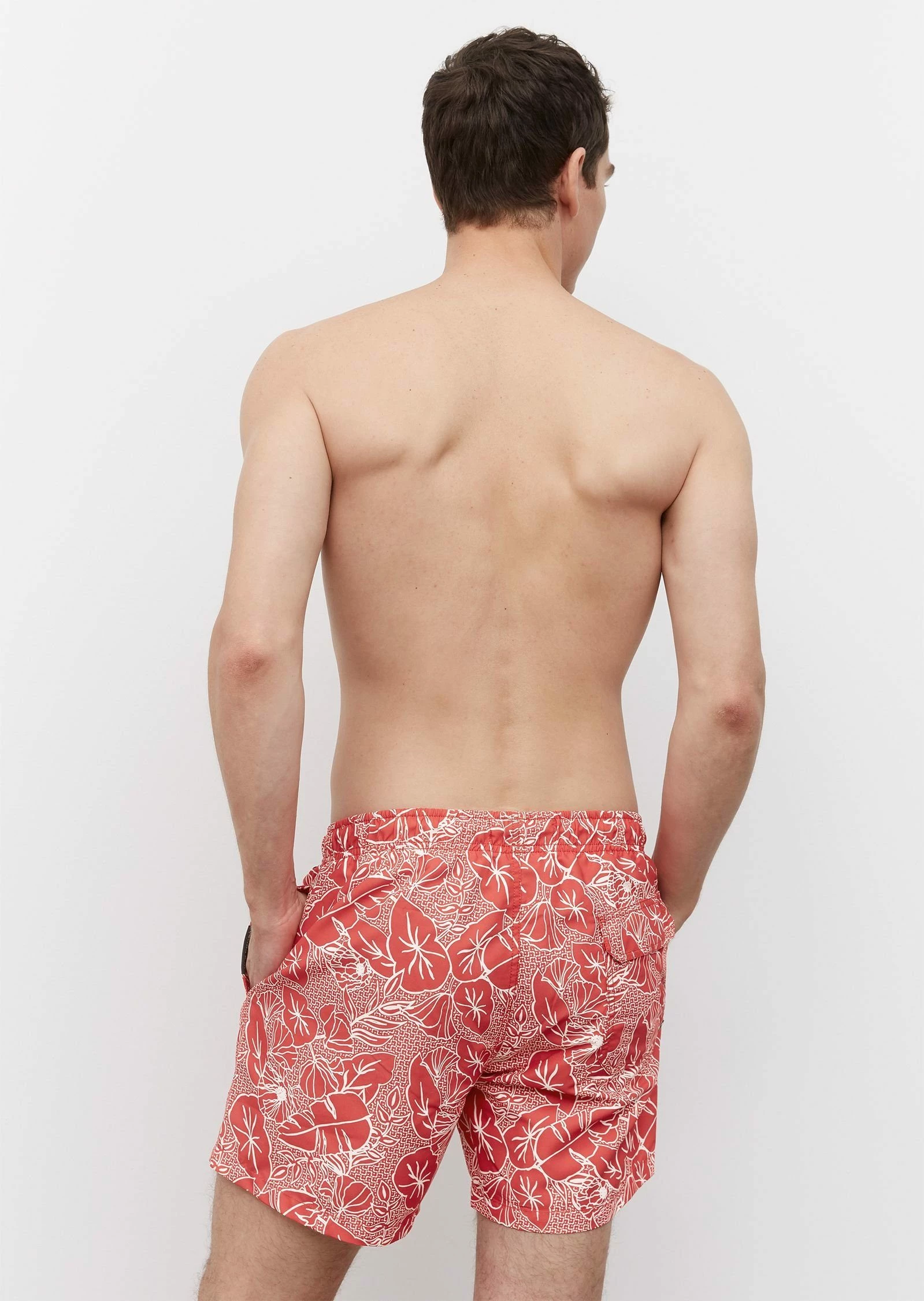 rote Beachshorts für Herren, aus der Marc O’Polo Serie “Printed Beach”, tropisches Blättermuster in Off-white, elastischer Bund mit naturweißer Bindekordel und Metall-Enden, zwei Seitentaschen, Innenslip aus hautfreundlichem Mesh und Weblogo im inneren Rückteil, aus atmungsaktiver, komfortabler Webware // Länge: 40 cm